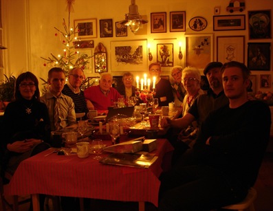 fr.v. Mamma, Ville Bror, Peller Gerogsson, Farfar Folke, Farmor Karin, Nisse, Plastmorfar Ragnar, Mormor Elvy, Pappa Stig, Bror Olle.