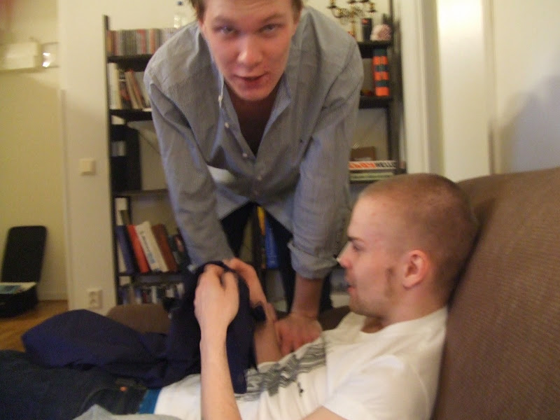 Baggen och Johannes håll kom precis hem. De började med att stå och plinga på dörren tills jag kom och öppnade men då öppnade de med nyckeln de djävlarna. Här på bilden så ska Baggen se ut som att han suger av Hållen men han bangar ur precis innan bilden tas för "nej jag kan inte göra så på första bilden".